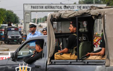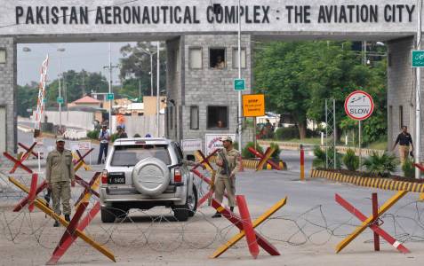 Pakistan army soldiers stand guard at the Minhas base at Kamra, in Punjab province