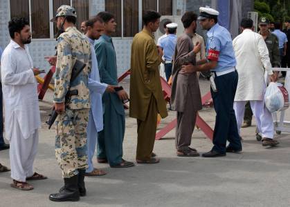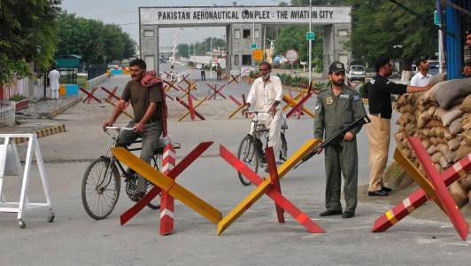 Members of Pakistan's Air Force search people at the main entrance of the Minhas base at Kamra, in Punjab province