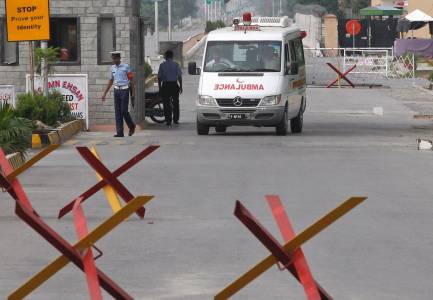 An ambulance is seen inside the Minhas base at Kamra, in Punjab province